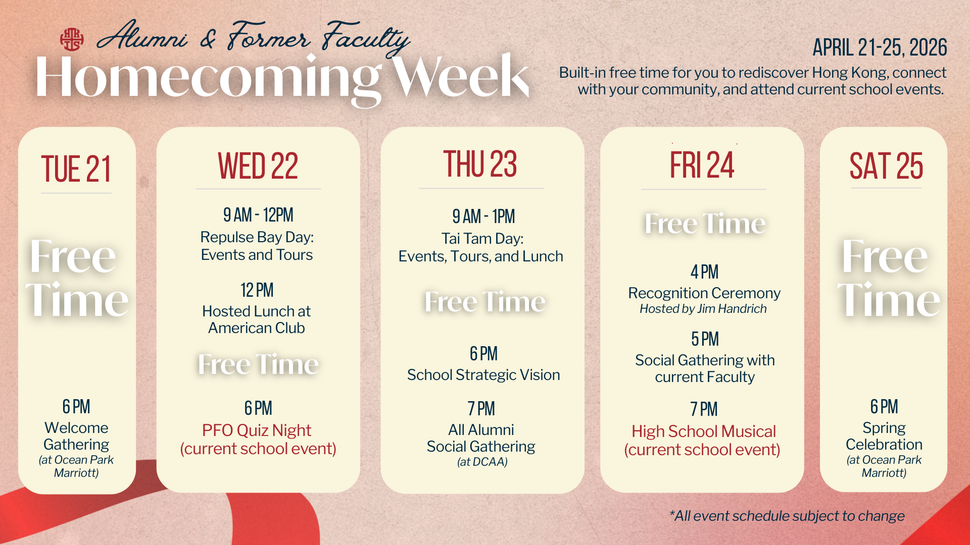 Join us for Homecoming Week, bringing current and former students, faculty, administrators, staff, and parents together for a week of celebration, learning, and reflection. This reunion week celebrates the school’s legacy and its evolution in tandem with the dynamic changes in Hong Kong over the last 60 years.